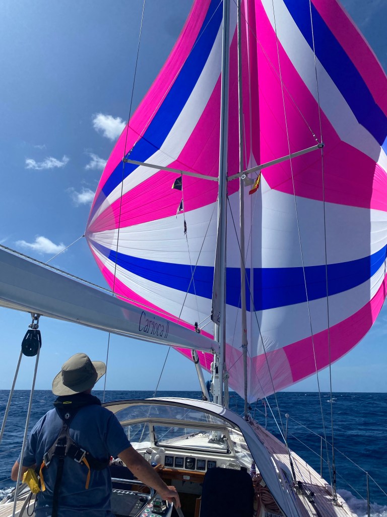 Richard used his finest rolling hitch to take the pressure of the line, which we fed back to another winch to allow us to remove the block and release the sheet to lower the sail. All handled with great skill and calmness by the crew and a great exercise in recovery. Really pleased with that as it builds confidence that we can handle difficult situations under stress.