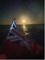 We had a beautiful moonrise after dinner. We have been blessed with a waxing moon over the past week which has given us incredibly light nights. Despite this we are still being hit by flying fish every night. 3 perished last night. We can see scales all over the boat, were they have hit and bounced off, last night on the windscreen and the tender.