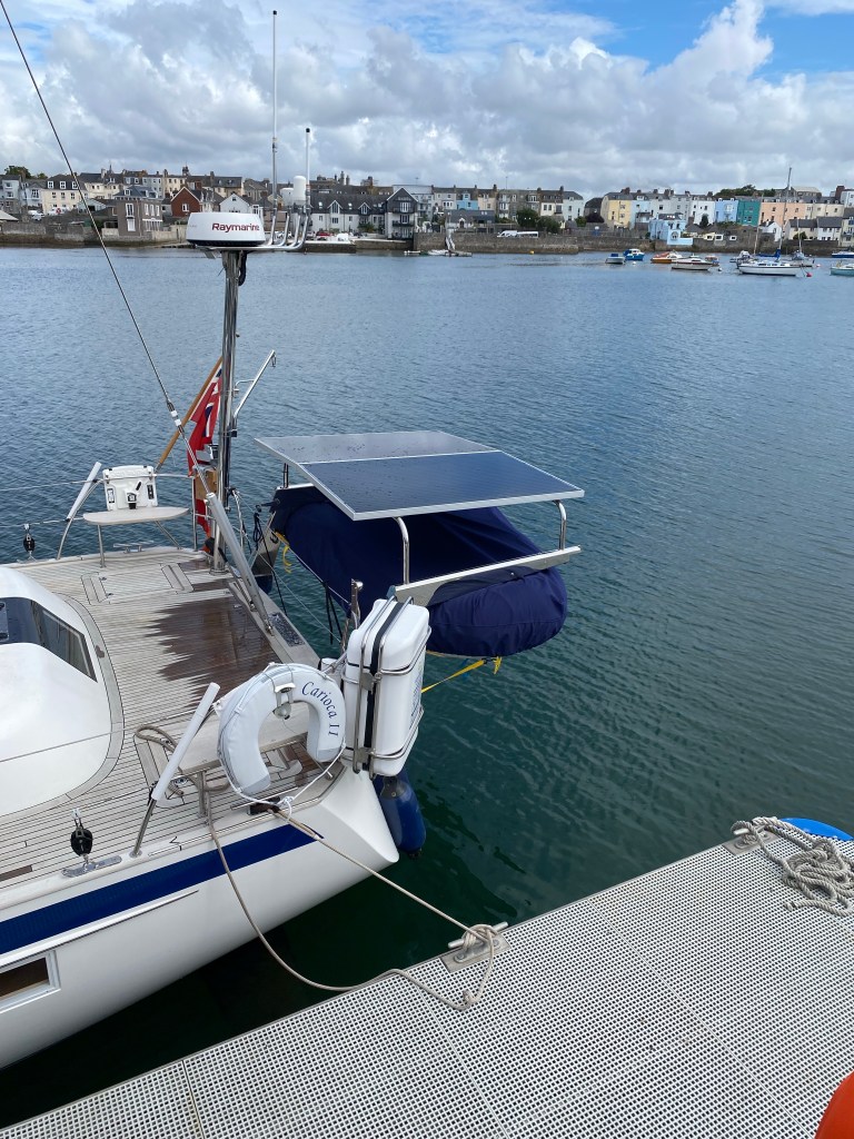 So I set about fixing arches to the davits and solar panels on top. I now have the capacity to produce 600w in good sun, which will make us nearly self sufficient in power, if the sun shines!